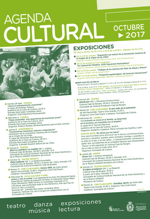 Redacción. Comenzamos el mes de octubre en Aranda de Duero y con él, una Agenda repleta de Actividades Culturales para todos los públicos y edades, en la que encontraremos charlas, cine, danza, conferencias, teatro…. y un montón de actividades que no dudamos serán del agrado de tod@s.