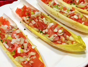 Elaboración: Retirar la piel del salmón y cortar en cubos pequeños, añadir el zumo del limón, un chorrito de aceite de oliva, sal y pimienta, llevar a la nevera durante 10 minutos. Cortar el aguacate en cubos pequeños, salpimentar. Mezclar el aguacate con el salmón y las semillas de chía con mucho cuidado para no destrozar el aguacate, rectificar sabor con sal y pimienta. Finalmente, retirar un poco del tallo de las endivias y rellenar con la mezcla.