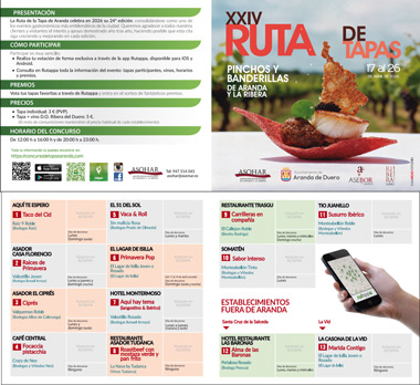 Con más de dos décadas de trayectoria, la Ruta de Tapas se ha convertido en una de las citas imprescindibles del calendario local. En esta edición, 13 establecimientos de Aranda de Duero y su entorno competirán por conquistar el paladar del público con elaboraciones originales y llenas de sabor.